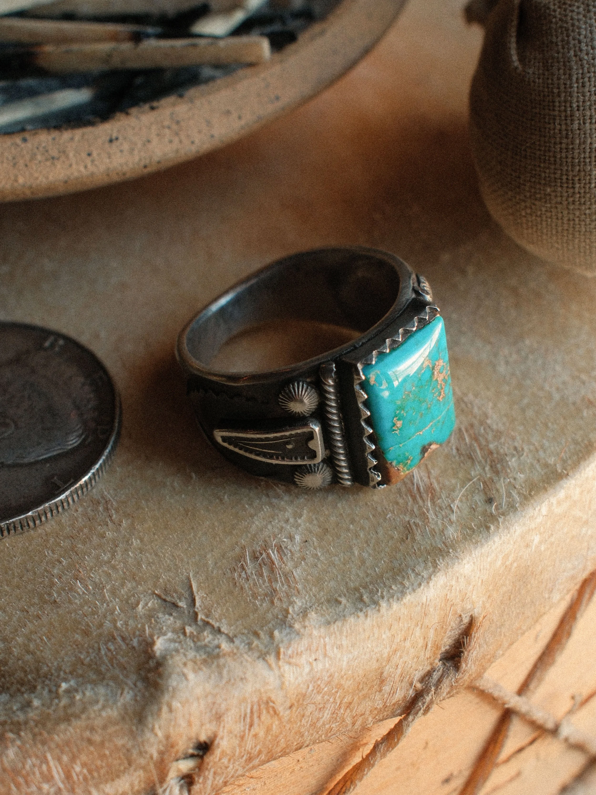 In preparation for the holidays, Chad’s been working hard to bring more Heritage (One-of-a-kind) pieces to the shop—especially rings. Premium Kingman turquoise rings, each one cut from the same vein but no stone alike. Each one is hand-stamped, with added side work for depth. A few feature a hand filed serrated bezel. Each finishes with a taper that wears easy and true.