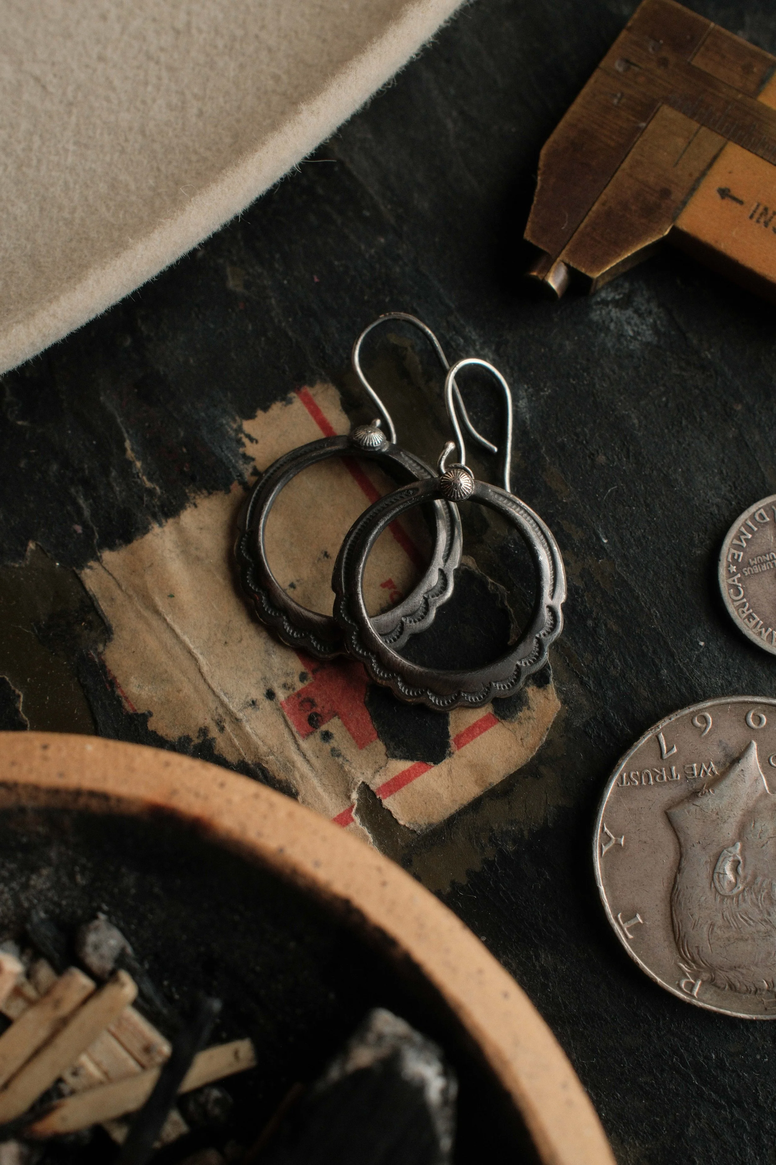 Developed in house by Chad, these traditional rain cloud earrings each have 5 graduated dangles and are finished with a strong patina.